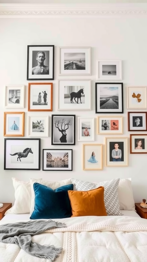 Creating a beautiful wall art arrangement can completely change the feel of a room. This setup showcases a mix of black and white photos along with colorful frames, making it visually interesting. The combination of different styles adds character to the space.