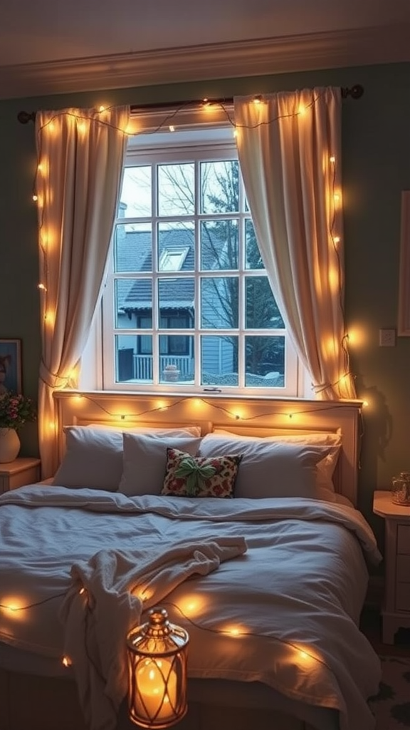 This cozy bedroom scene is all about those charming fairy lights. They hang gently around the window, creating a soft glow that brings warmth to the space. The lights wrap around the window curtains, giving the room a magical feel, perfect for relaxation or reading.